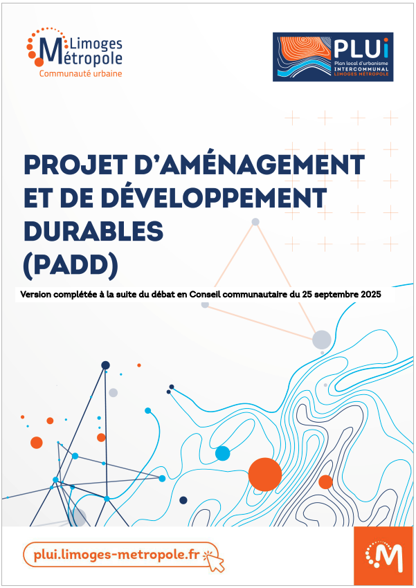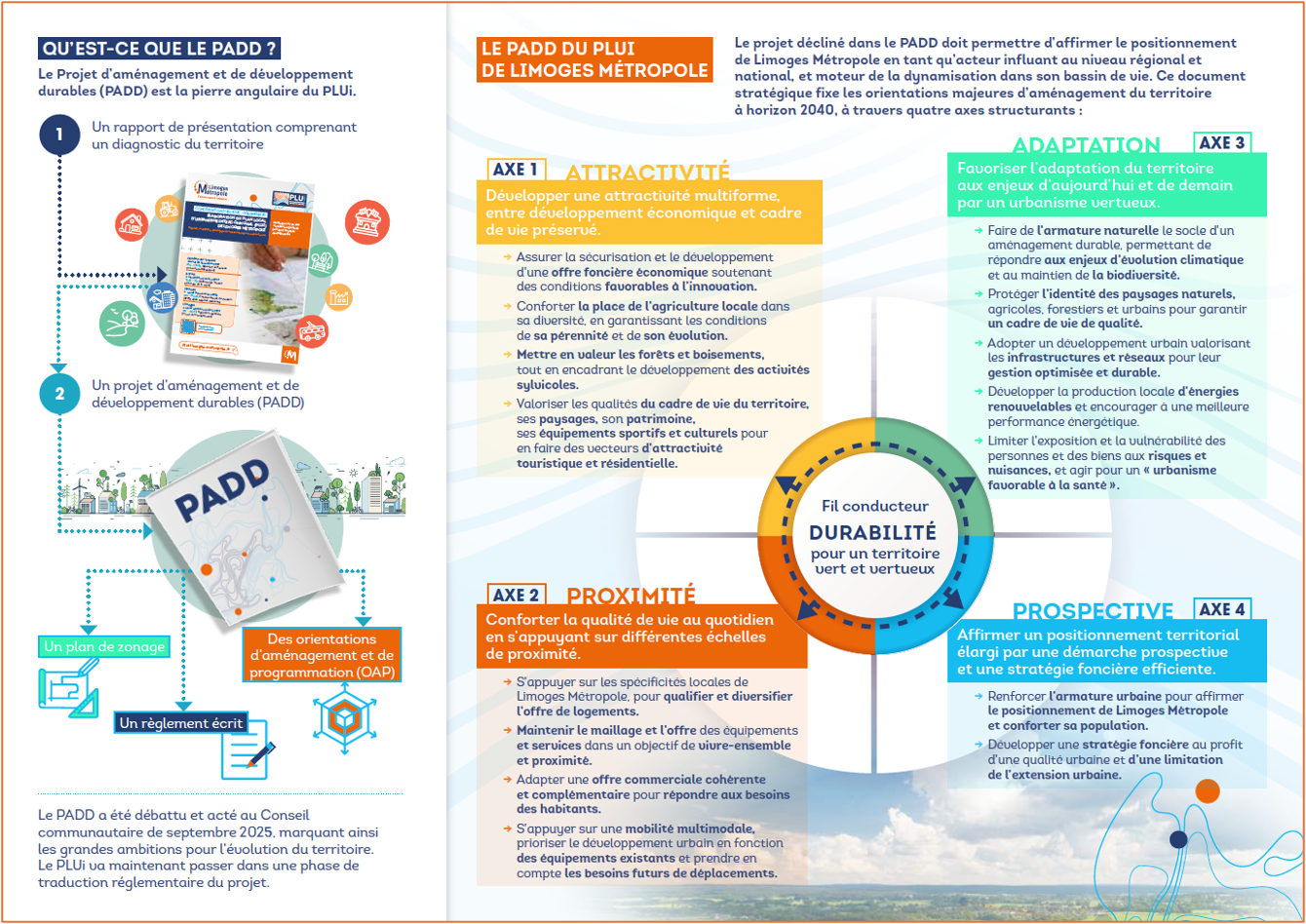 Le Projet d'aménagement et de développement durables (PADD), dans sa première version de 2025, expose les grandes orientations d'aménagement du territoire de Limoges Métropole à horizon 2040. Il répond aux enjeux du Diagnostic territorial définies préalablement et fixe une vision de développement du territoire à travers 4 grands axes structurants :